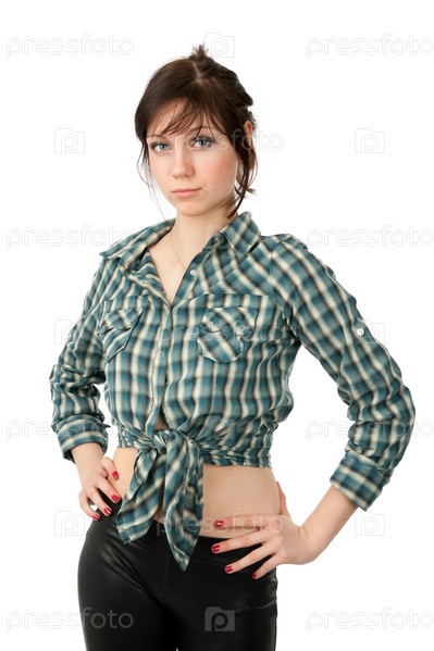 Девушка в клетчатой зеленой рубашке на белом фоне