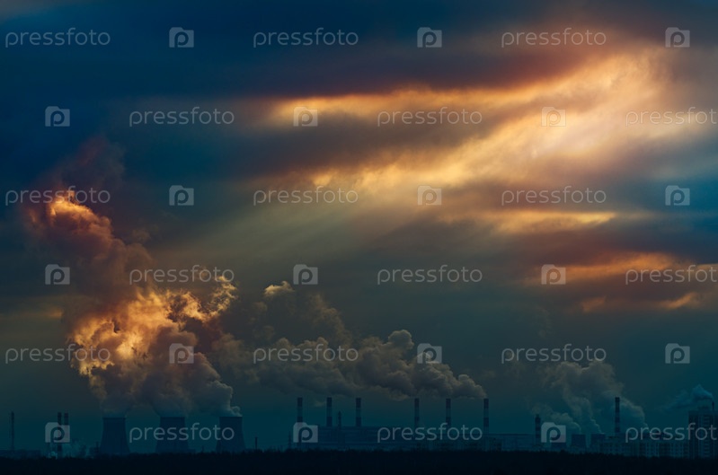 Дымящие фабрики и лучи света, пробивающиеся сквозь облака