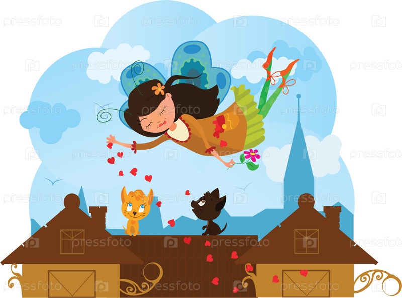 Летящая фея бросает сердечки кошкам на крыше дома