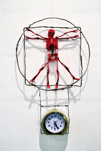 Красный скелет и будильник в рамке из проволоки