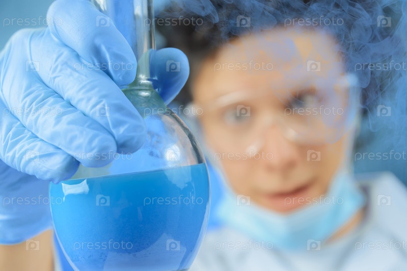 Ученый смотрит на колбу с жидкостью