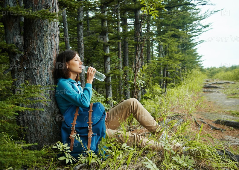 Турист-женщина пьет воду