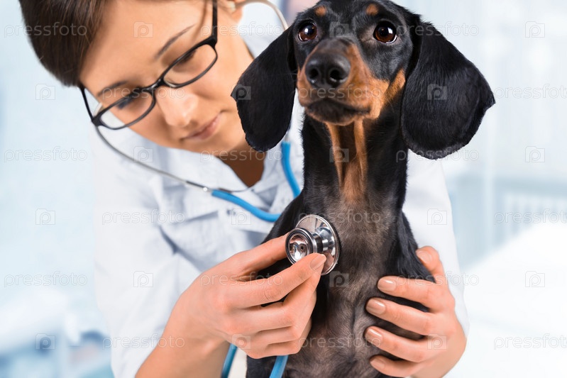 Ветеринар слушает таксу