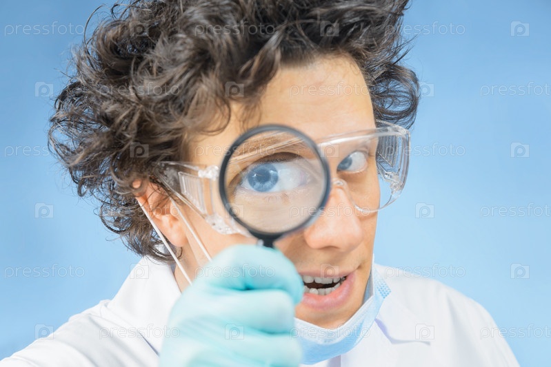 Безумный доктор смотрит через увеличительное стекло