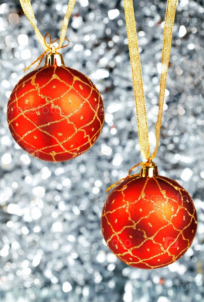 Два красных новогодних шара висят на ленте на серебристом фоне