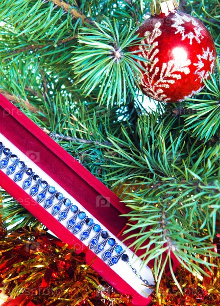Новогодние украшения на ветках сосны