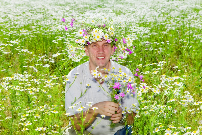 Улыбающийся молодой человек в венке из цветов сидит на поле ромашек