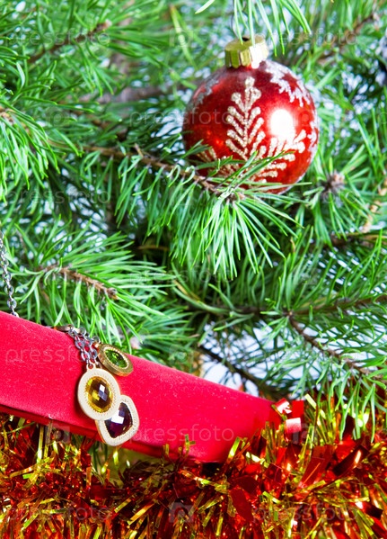 Подарочная коробка с ожерельем на новый год под елкой