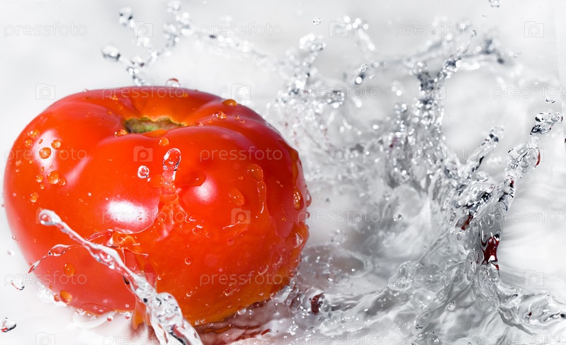 Красный помидор в брызгах воды