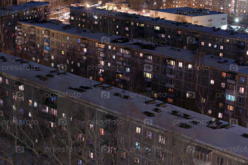 Вечерний городской пейзаж: пятиэтажные дома с уютным светом в окнах