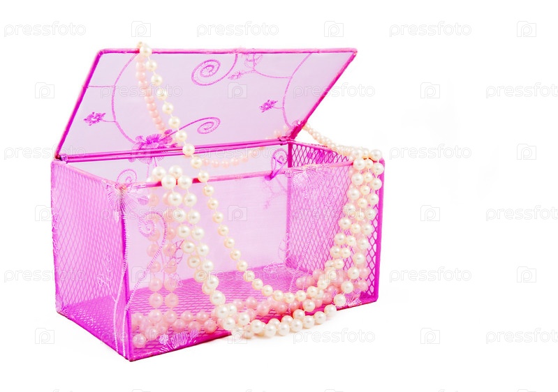 Шкатулка розовая и жемчужные бусины на белом фоне