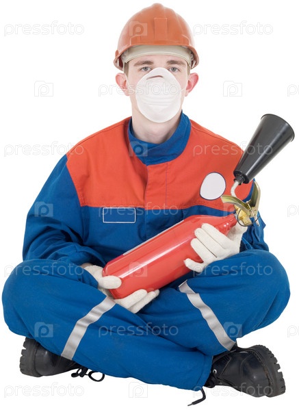 Мужчина в комбинезонах и огнетушителе на белом фоне