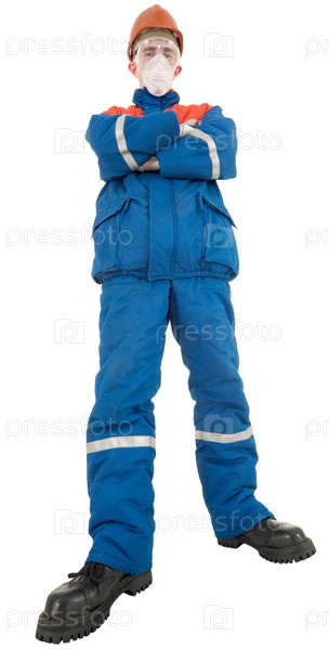 Мужчина в комбинезонах и огнетушителе на белом фоне