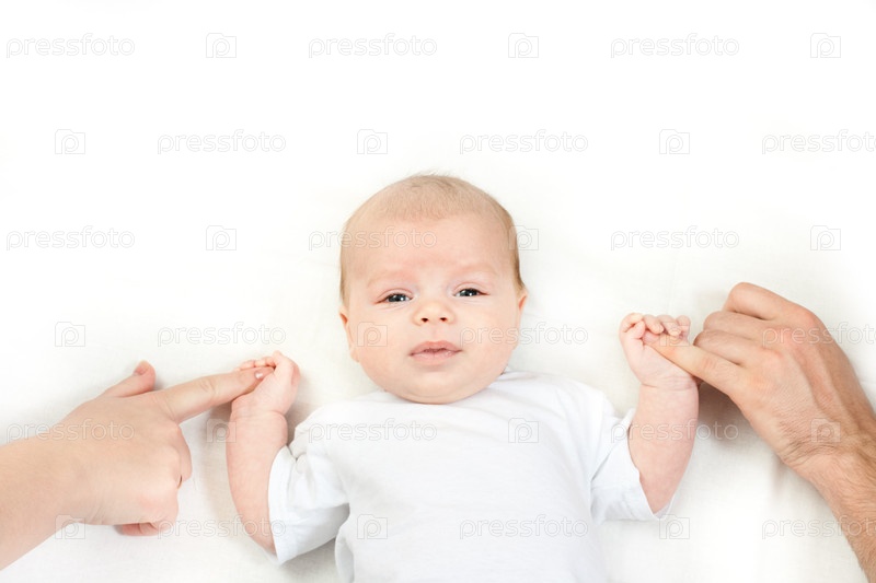 Счастливый семейный дом: маленький ребенок, лежащий на кровати и держащий пальцы матери и отца