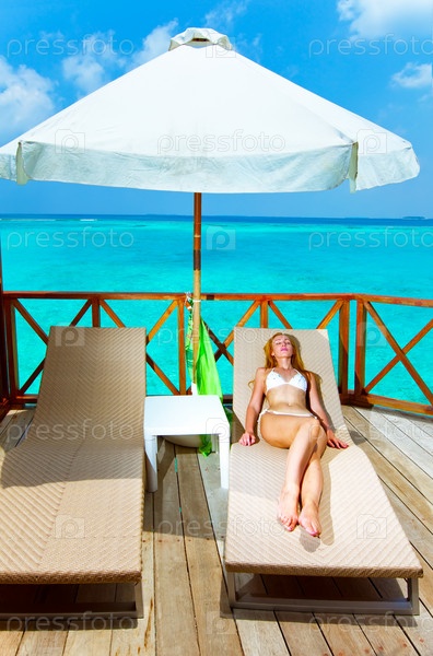 Молодая женщина загорает на террасе, Мальдивские Острова