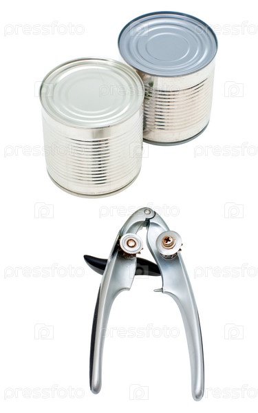 Металлические банки и открыватель для банок изолированы на белом фоне