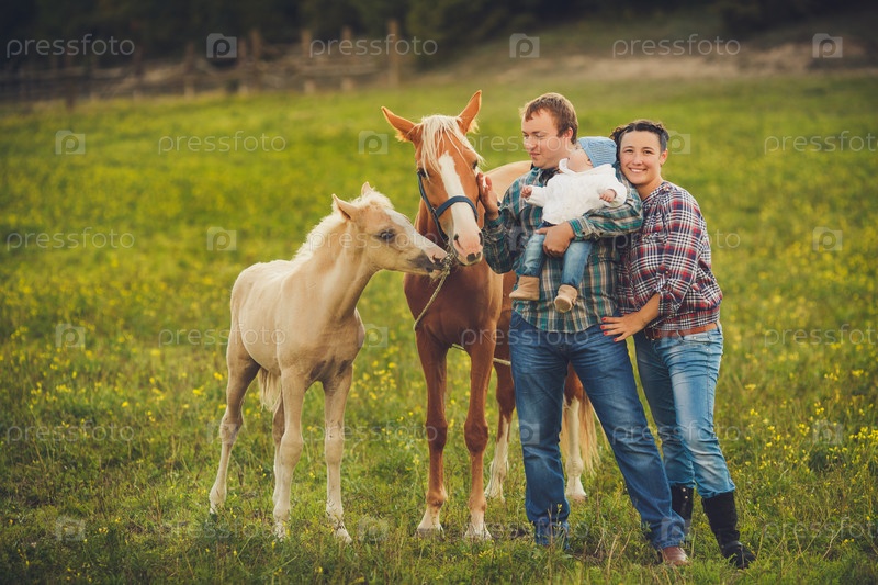 Счастливая семья с лошадьми