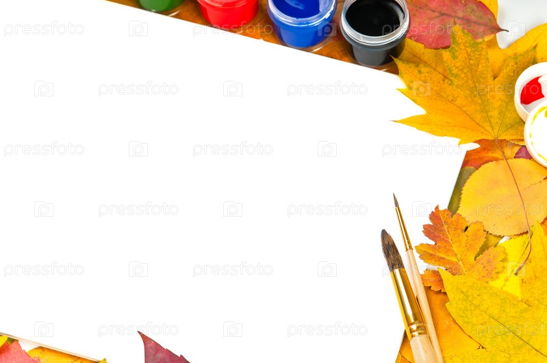 Белый лист бумаги, краски, кисточки, осенние листья