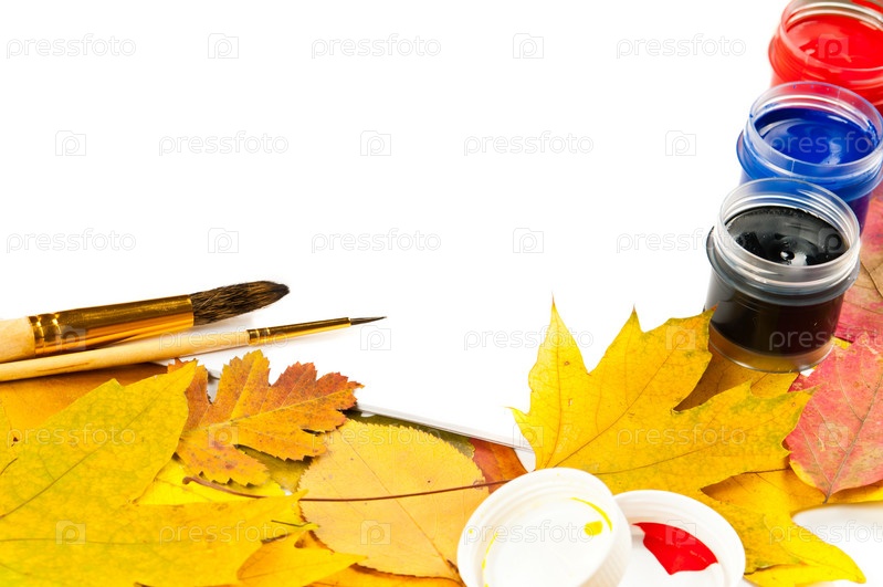 Белый лист бумаги, краски, кисточки, осенние листья