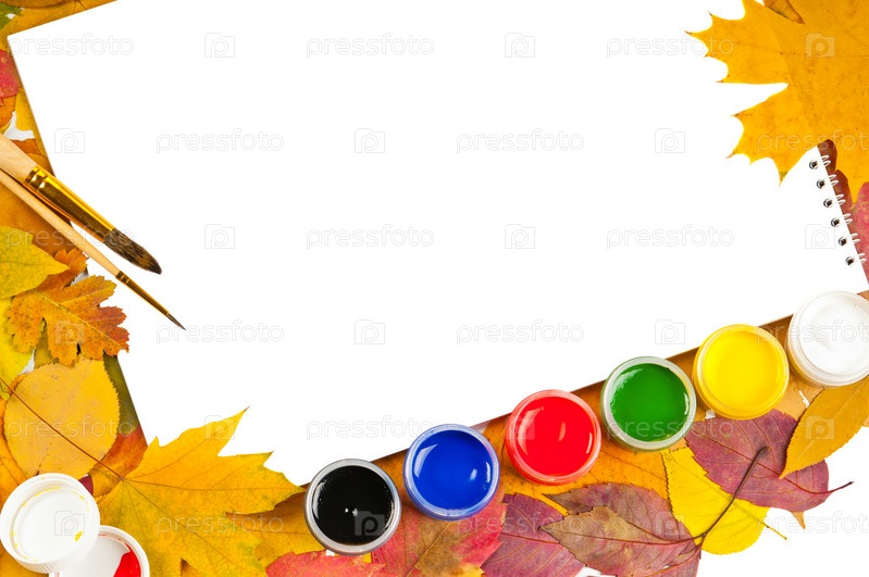 Белый лист бумаги, краски, кисточки, осенние листья