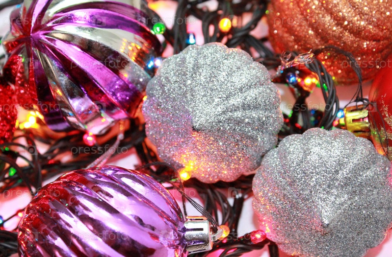 Елочные шары и гирлянда. Крупный план