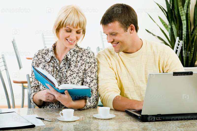 Красивая женщина держит книгу и демонстрирует текст своему парню в кафе