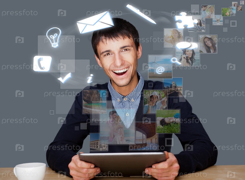 Молодой человек с планшетным компьютером. Концепция информационной технологии