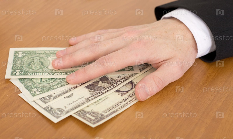 Человек вручает пачку долларов