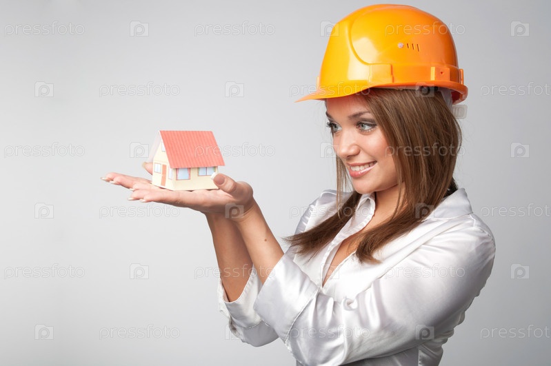 Молодая девушка в строительной каске держит в ладонях игрушечный домик