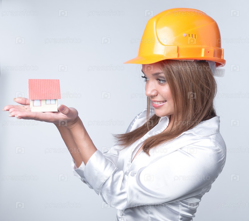 Молодая девушка в строительной каске держит на ладони игрушечный домик