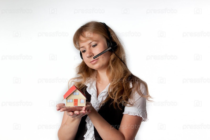 Молодая девушка-оператор держит на ладони игрушечный домик