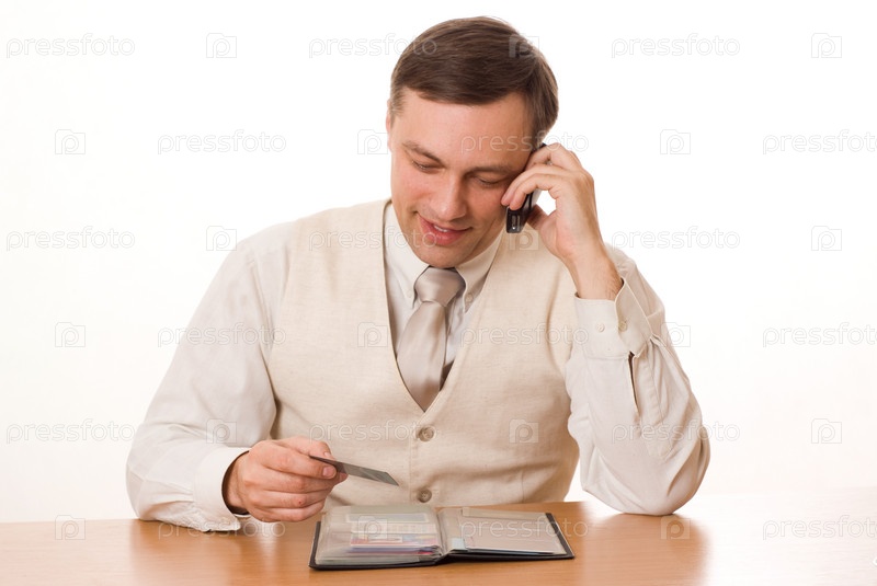 Красивый молодой предприниматель с телефоном, сидя за столом на белом фоне