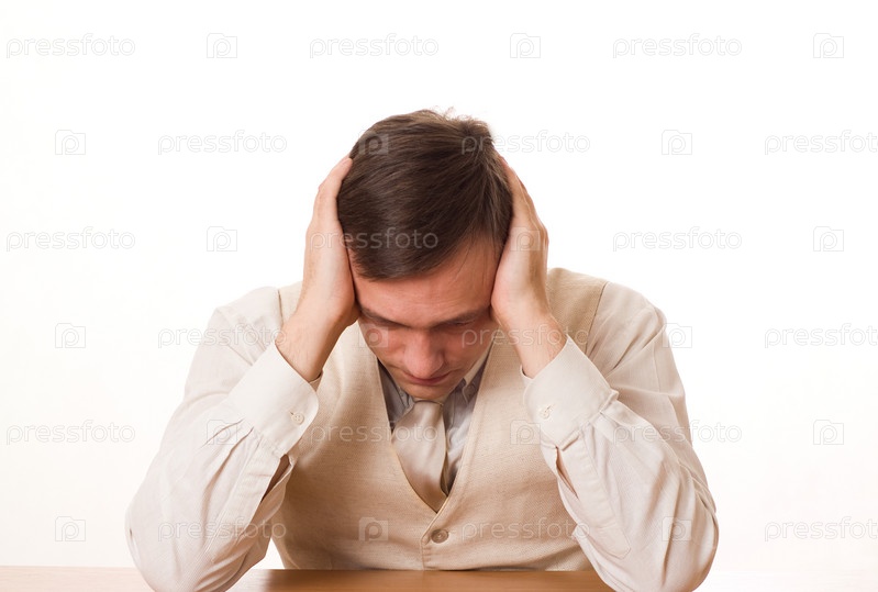Красивый молодой предприниматель, сидя за столом на белом фоне