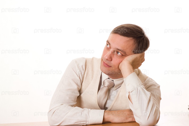 Красивый молодой предприниматель, сидя за столом на белом фоне