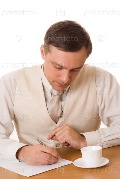 Красивый молодой предприниматель, сидя за столом на белом фоне