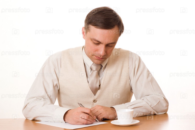 Красивый молодой предприниматель, сидя за столом на белом фоне