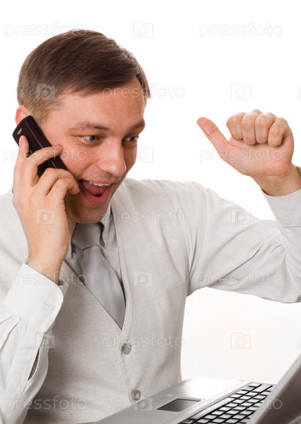 Бизнесмен, работает с ноутбуком на белом