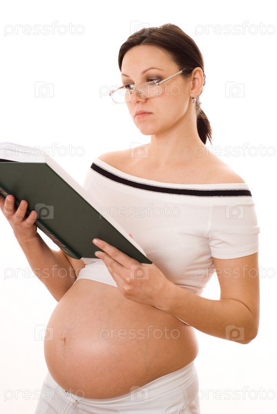 Красивая беременная женщина с книгой на белом фоне