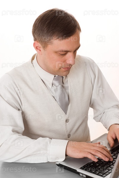 Молодой предприниматель работает с ноутбуком на белом фоне