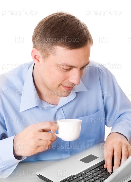 Молодой предприниматель работает с ноутбуком и держит чашку на белом фоне