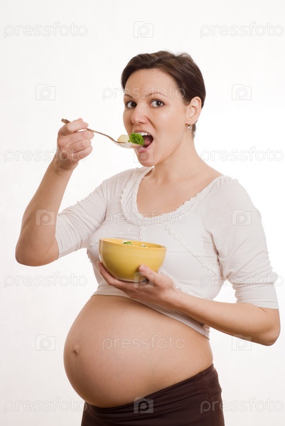 Молодая беременная женщина ест овощи на белом фоне