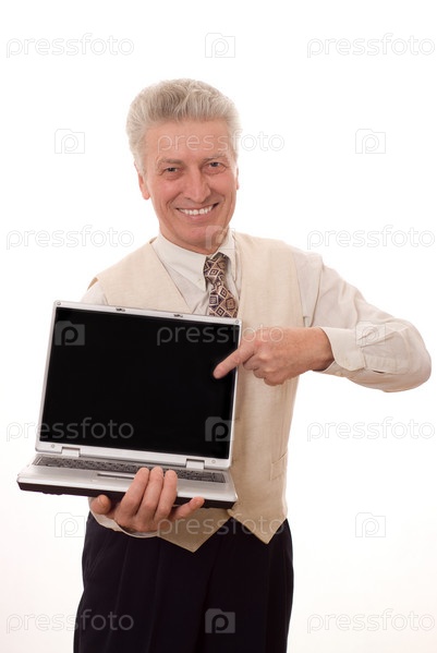 Мужчина держит ноутбук с пустым экраном, где вы можете написать ваш текст