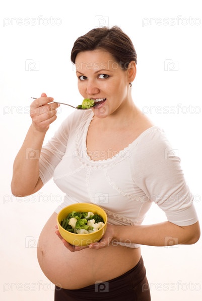 Молодая беременная женщина ест овощи на белом фоне