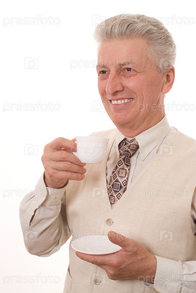 Портрет бизнесмена пьющего из чашки на белом фоне