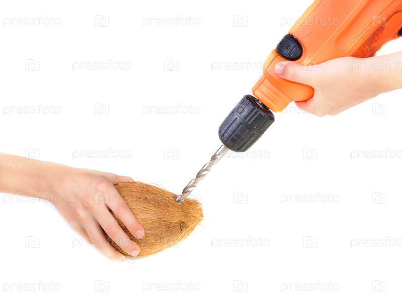 В кокосе сверлят дырку дрелью