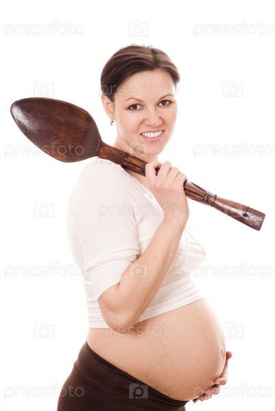 Молодая беременная женщина с ложкой на белом фоне