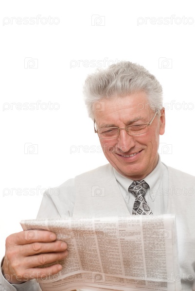 Бизнесмен среднего возраста, читает газету на белом фоне