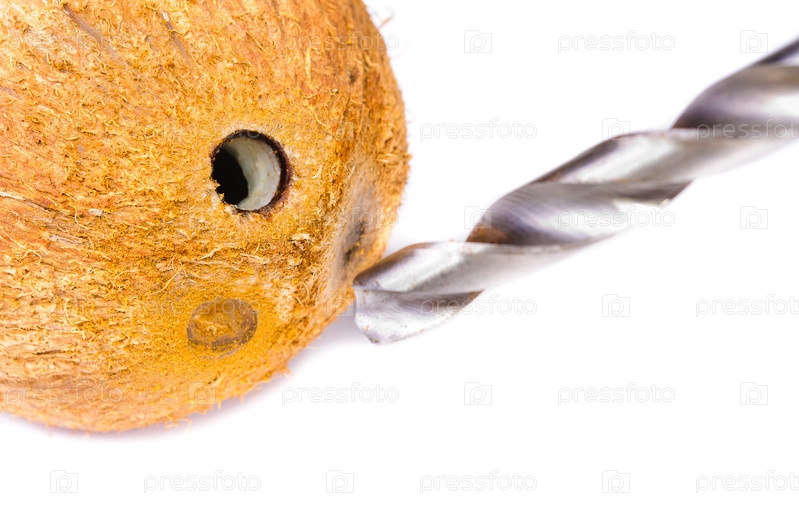 Сверло и кокос с дыркой крупным планом