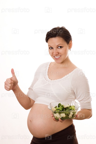 Молодая беременная женщина с овощами на белом фоне