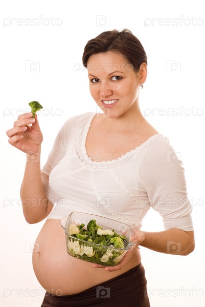 Молодая беременная женщина с овощами на белом фоне